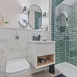 La pièce comprend un coin salon avec un lave-linge et des murs insonorisés pour un plus grand confort. Dans la salle de bain, les clients de l'appartement ont accès à un sèche-cheveux, des articles de toilette gratuits et des draps de bain. Une douche à l'italienne et une toilette séparée sont également disponibles.